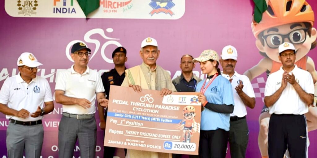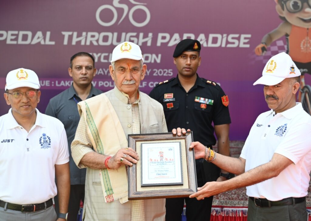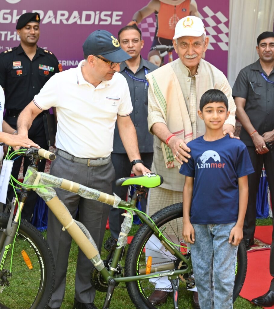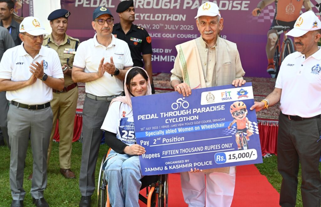 سری نگر// لیفٹیننٹ گورنر منوج سِنہا نے سری نگر میں منعقدہ ’پیڈل تھرو پیراڈائز‘ سائیکل ریس ۔2025 کی پُر وقار تقریب میں شرکت کی جو جموں و کشمیر پولیس کی جانب سے منعقد کی گئی تھی۔اُنہوں نے جیتنے والوں کو مبارک باد دِی اور شرکأکے جوش و جذبے اور اتحاد کے جذبے کو سراہا۔اِس مقابلے میں ملک کے مختلف حصوں سے 5,500 سے زائد سائیکل سواروں نے 10 زمروں میں حصہ لیا۔