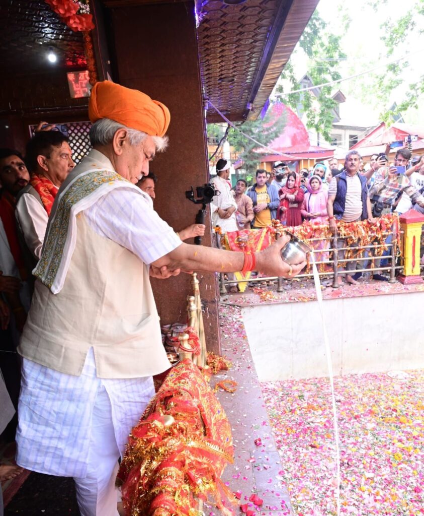 سری نگر//لیفٹیننٹ گورنرمنوج سِنہا نے جیشٹھ اشٹمی کے موقعہ پر ماتا کھیر بھوانی مندر تولہ مولہ گاندربل میں یاتری بھون کا سنگ بنیاد رکھا۔اُنہوں نے ماتا کھیر بھوانی میں حاضری دی اور سب کی سلامتی ، خوشحالی ، ترقی اور بھلائی کے لئے دعا کی ۔اُنہوں نے عقیدتمندوں سے بات چیت کی اور اِس موقعہ پر دِل کی گہرائوں سے مُبارک باد دی۔