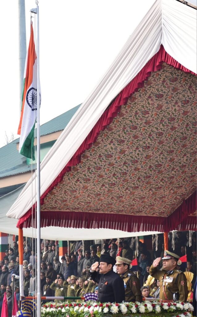 مشیر راجیو رائے بھٹناگر نے بڑے اِجتماع سے خطاب کرتے ہوئے جموں و کشمیر کے لوگوں ، آرمڈ فورسز، نیم فوجی دستوں، مرکزی اور یوٹی سطح کے پولیس دستوں کے اَرکان کو ہماری قوم کی سلامتی اور سا لمیت کو برقرار رکھنے میں ان کے تعاون کے لئے دِلی مُبارک باد پیش کی۔اُنہوںاپنے خطاب میں کہا کہ اس برس ہمارا ملک ’’اِنڈیا ۔ مدر آف ڈیموکریسی‘‘ اور ’’وِکست بھارت‘‘ کے موضوع کے تحت یہ دِن منا رہا ہے۔ اُنہوں نے کہا کہ 1950 میں ہندوستان کا آئین نافذ ہوا، ڈاکٹر بی آر امبیدکر کی دور اندیش قیادت میں تیار کردہ آئین نے نہ صرف بنیادی حقوق اور آزادیوں کی ضمانت دی بلکہ اِنصاف ، مساوات اور بھائی چارے کی اَقدار کو بھی شامل کیا۔مشیر موصوف نے شہریوں پر زور دیا کہ اَپنے آئین کا احترام کرنے کے ساتھ ساتھ ہم سب کو اِنصاف، آزادی، مساوات اور بھائی چارے کے تئیں اَپنے عزم کا اعادہ کرنا چاہئے اور عدم رواداری اور امتیازی سلوک کے خلاف ایک ساتھ کھڑے ہونا چاہیے، ایسے ماحول کو فروغ دینا چاہیے جہاں ہر شہری ذات پات، مسلک یا صنف سے بالاتر ہوکر ترقی کر سکے۔